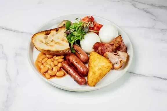 - Традиционный английский завтрак с яйцом, белой фасолью в томатном соусе, картофельными драниками и хрустящими тостами