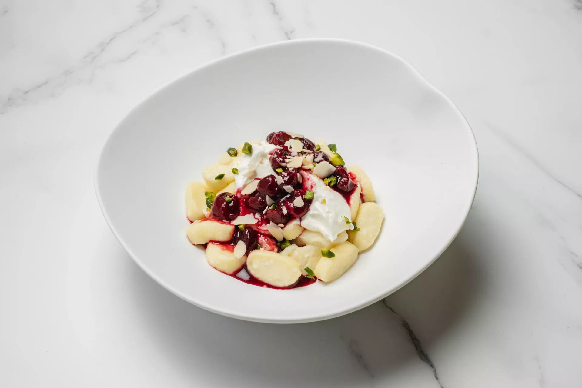 - Ленивые вареники с домашним вареньем из вишни и хрустящими фисташками