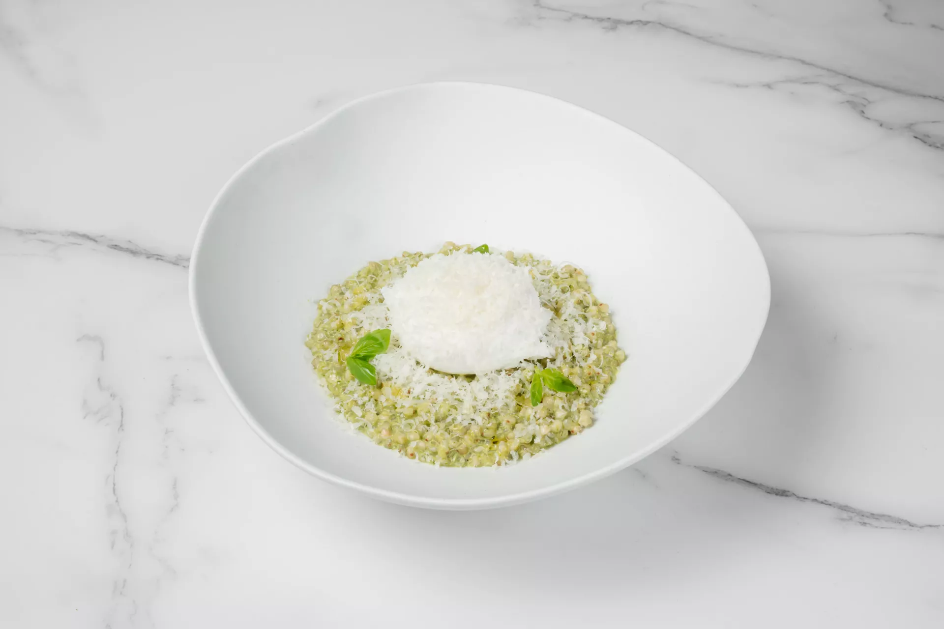 - Зеленая греча с яйцом-пашот, соусом пестом и пармезаном