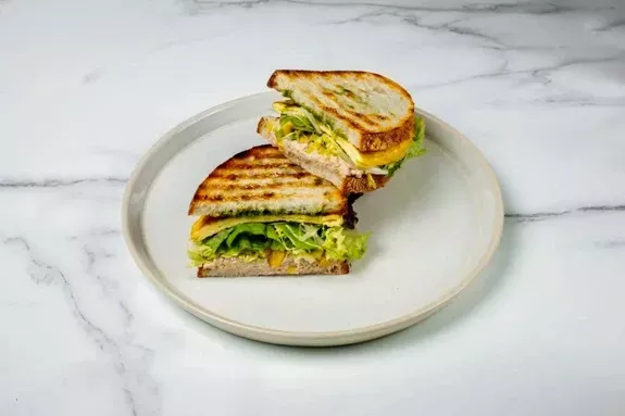 - Сэндвич с консервированным тунцом, кукурузой, листьями салата и соусом песто